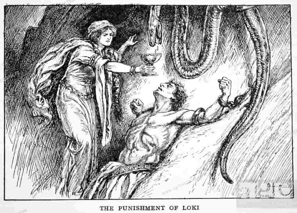 Loki’nin başının üstüne zehirli bir yılan koyarlar. Bu yılanın zehri sürekli Loki’nin yüzüne akmaktadır.